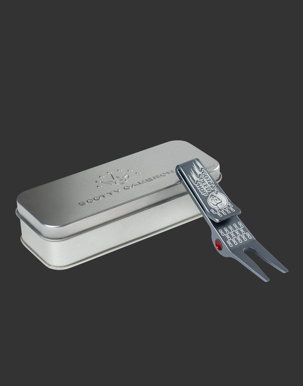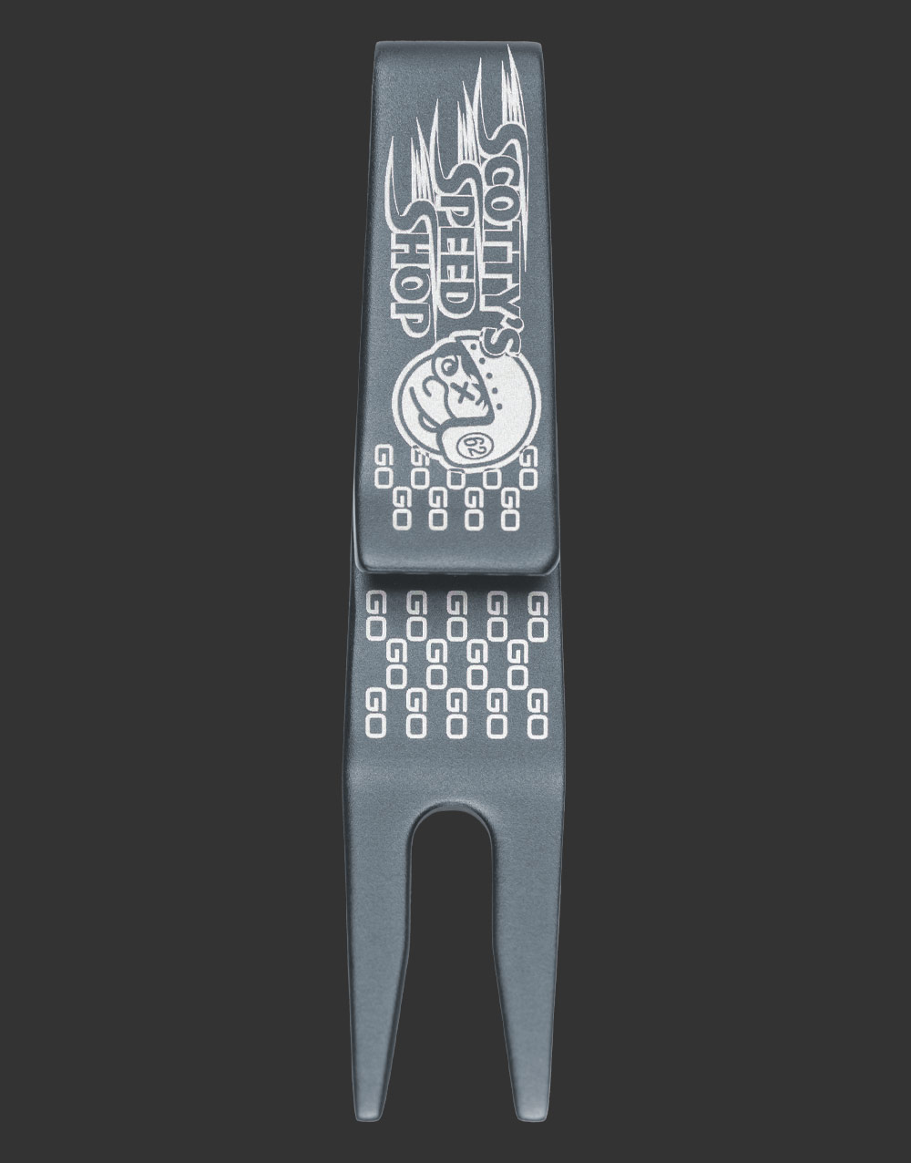 Go! Go! Go! With Scotty’s latest clip pivot tool featuring our Speed Shop mascot Johnny Racer, green repairs can be made faster than ever. Still the best way to keep the greens clean, this one has a misted feel with an anodized bright dip gray finish.