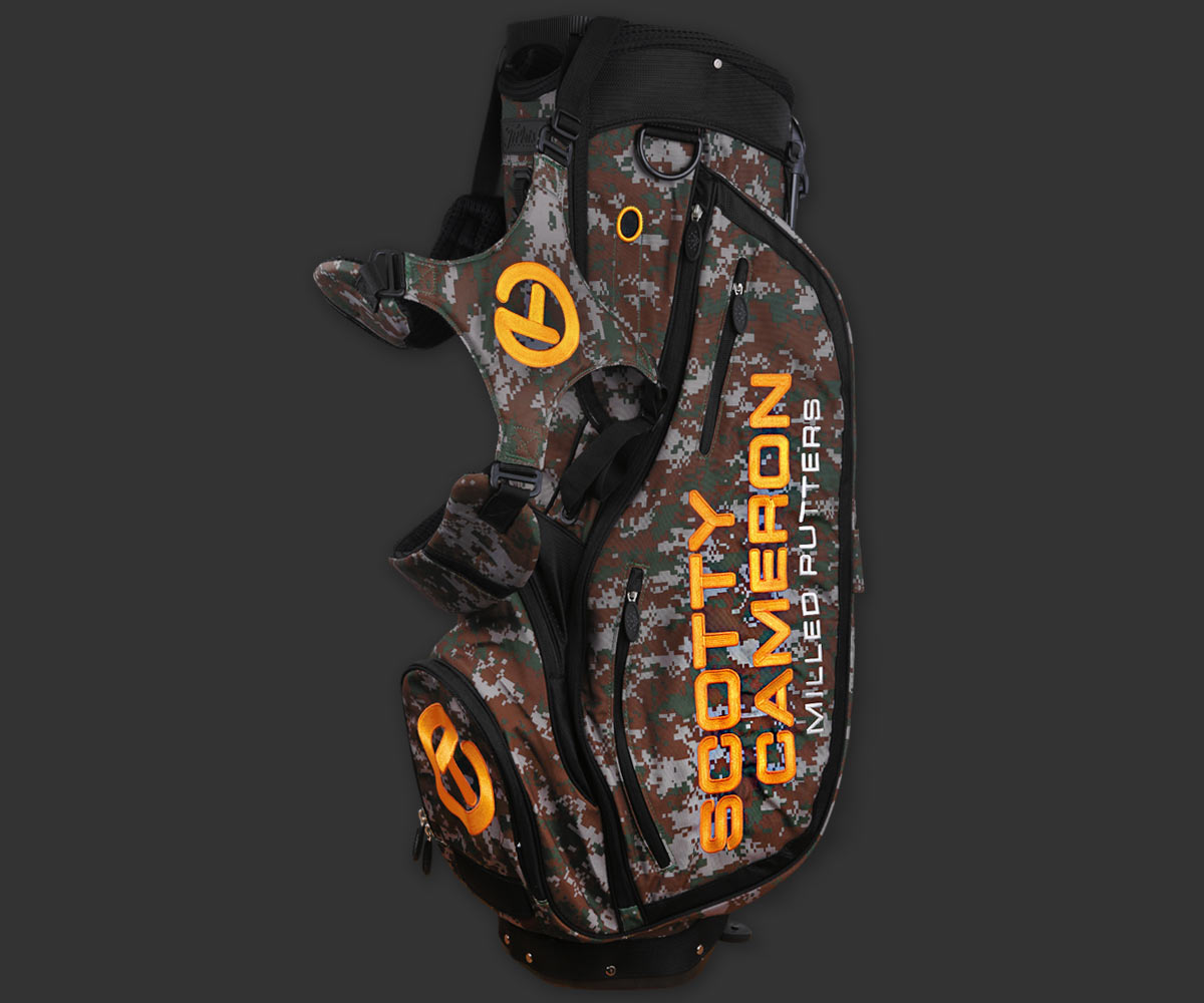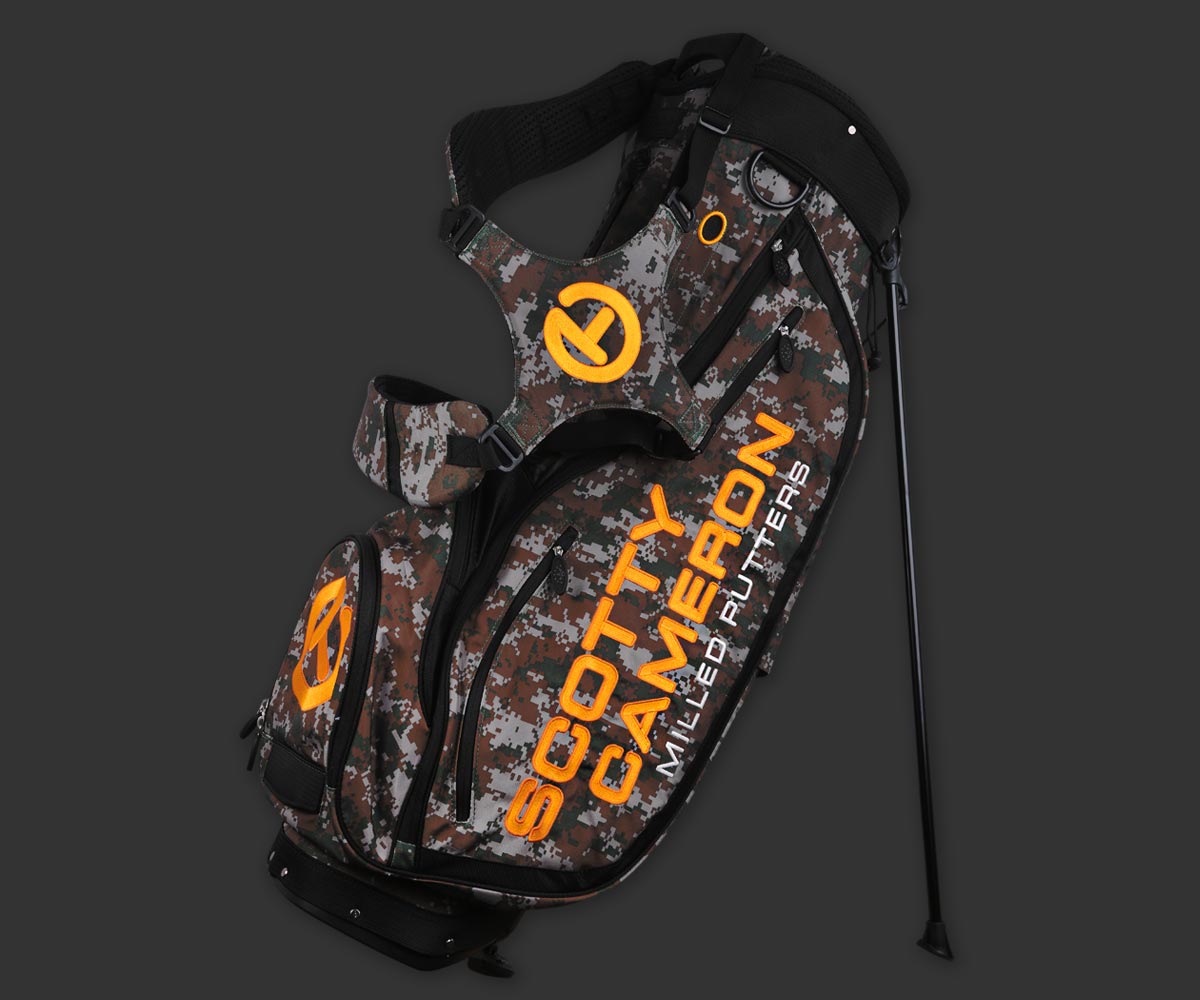 Designed by Scotty with Sun Mountain, this stand bag grabs the Scotty Bulldog by the horns with a tough digital camo pattern that's also elegantly embroidered with Circle Ts and Scotty Cameron badging. With three padded rows for your clubs and top dimensions of 10.25" x 9", this bag is as great-looking as it is functional. Check out the ample pockets for your golf gear, and legendary Sun Mountain design and construction. This bag won't last long, so get yours today only here in the Studio Store on ScottyCameron.com.